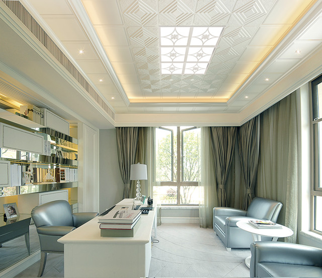中式風格的書房,符合典雅、樸實、具有傳統意義上的“書齋”的韻味。“斯是陋室,唯吾獨馨”就是中式風格書房的完美演繹。紅色仿木紋樣式的吊頂,置入中式家具,加上中式書柜、茶幾及屏風,配以中國字畫和古玩等點綴其間,就構成一幅中式風格的書房藍圖。進入這個書房學習,你是不是也會有種穿越的感覺。