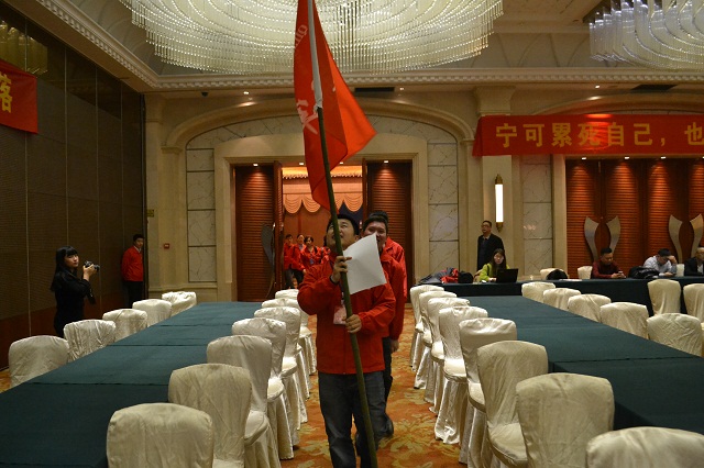 傍晚18:30,全國經銷商身著奇力吊頂紅色戰衣,用井然有序的四個方陣步入會場,本次大會分為四大隊伍:戰神隊、奇跡隊、冠軍隊、超人隊。每個隊伍由十幾個地區的優秀經銷商代表組成,他們將在今明兩天的活動中為各自的隊伍“參戰”,奮力贏取積分。