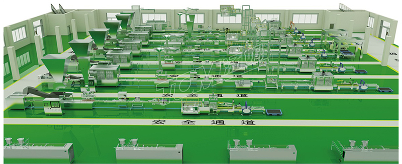 布局:車間按兩層設計,二層主要用于包材倉庫,加瓶、加蓋、自動開箱及投料。一樓主要有包裝流水線。